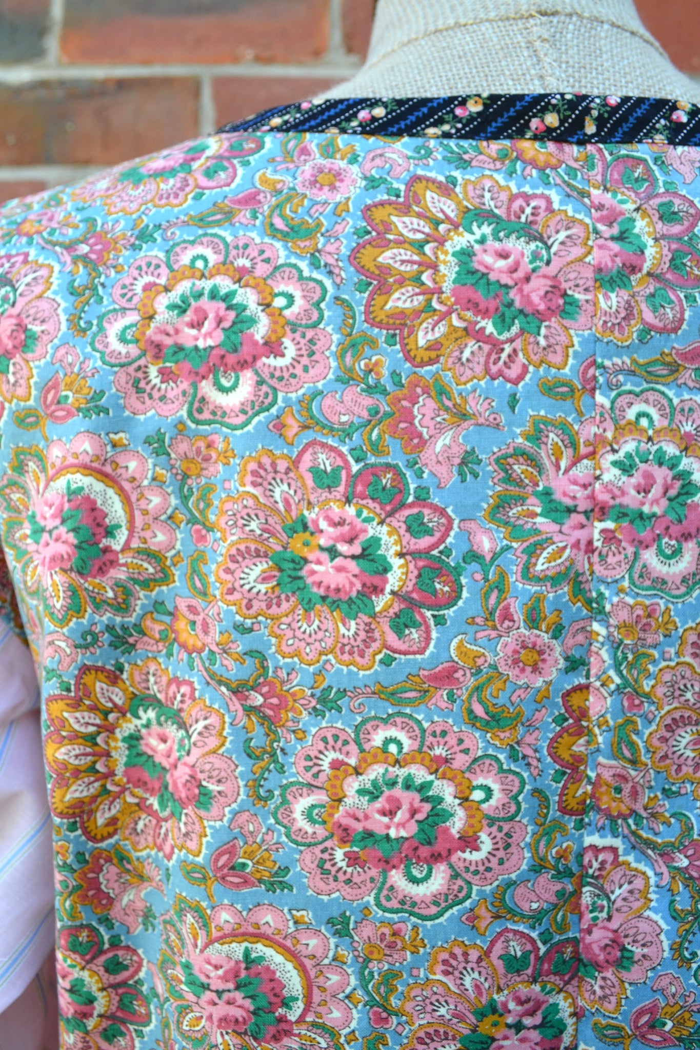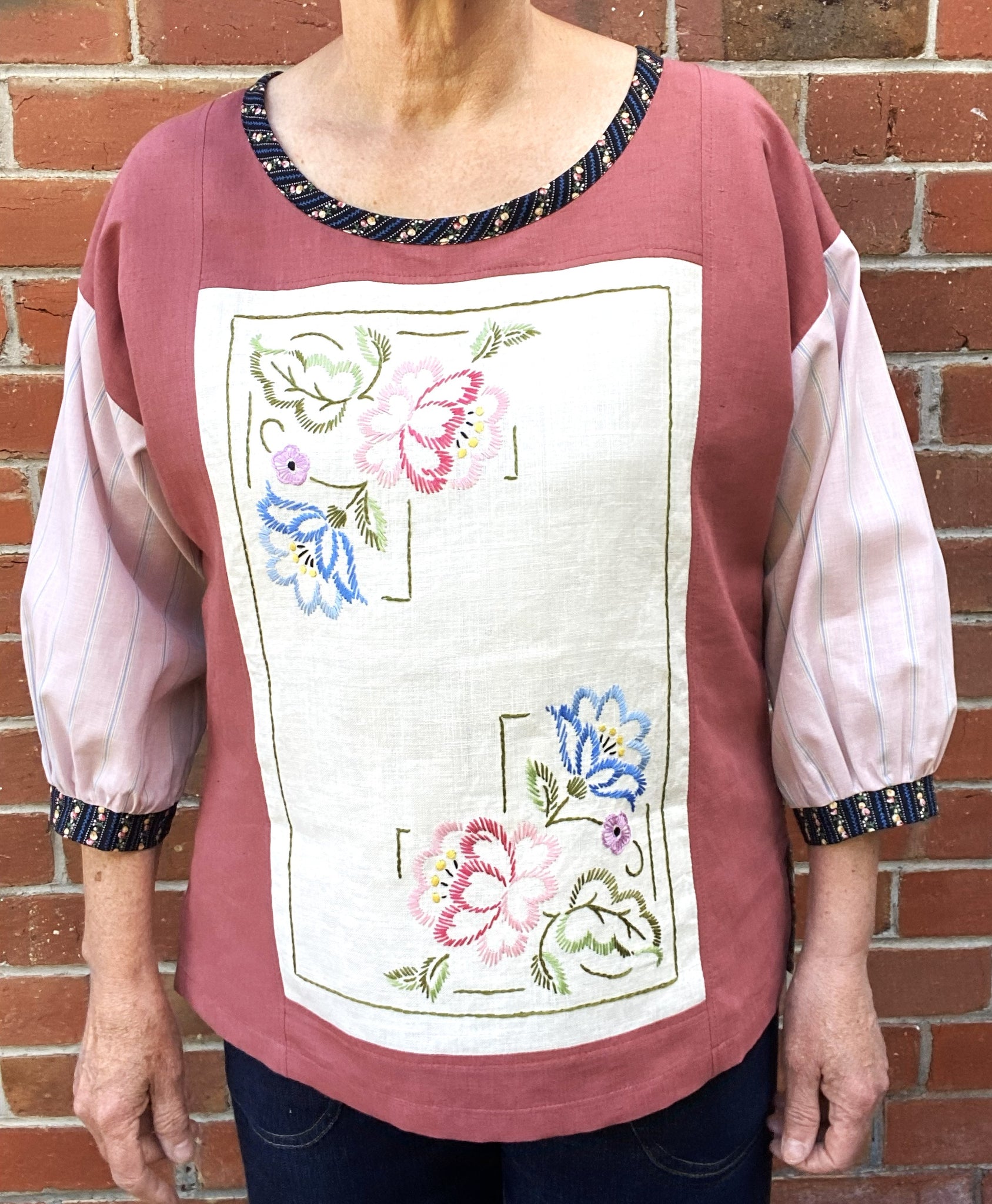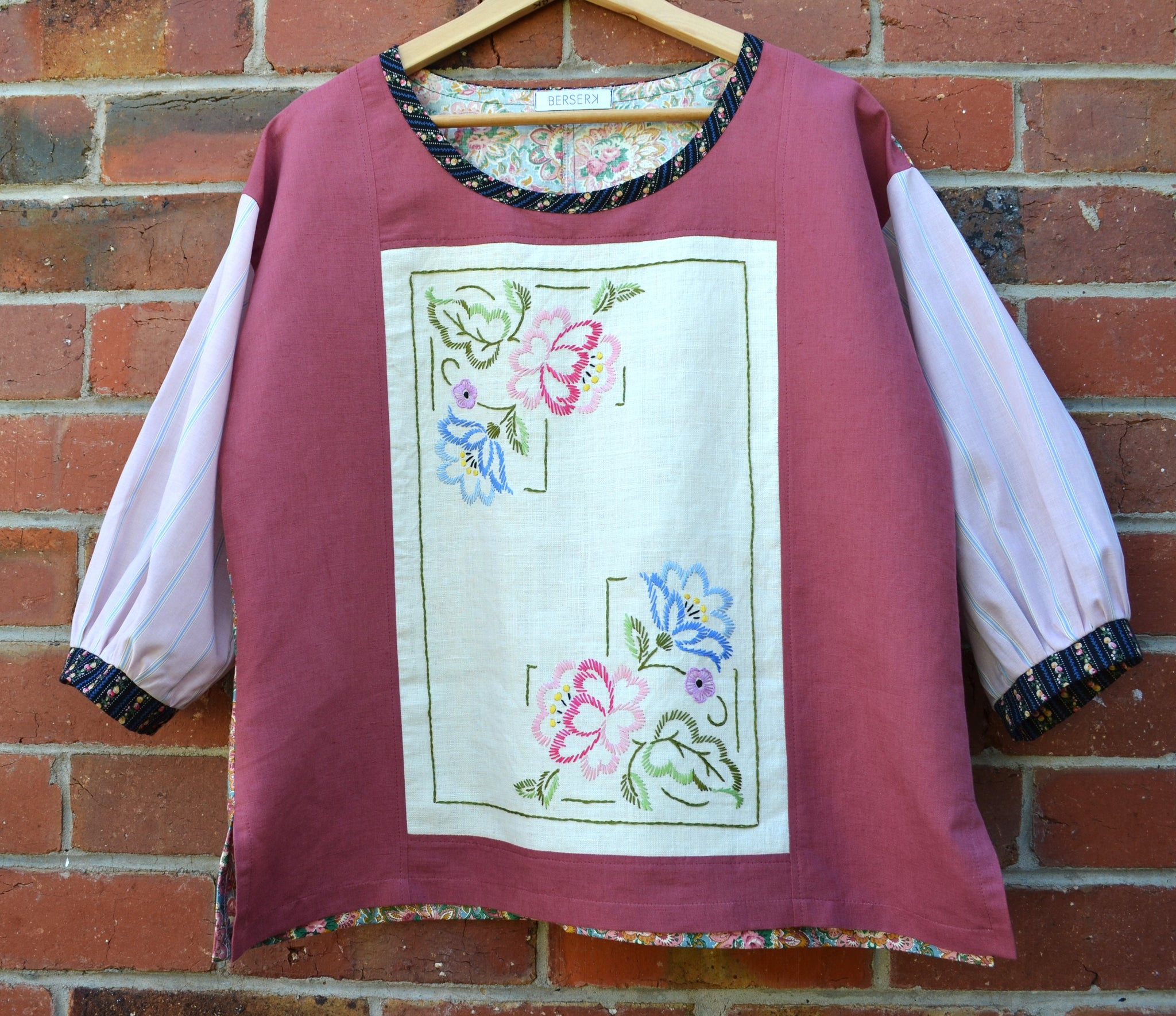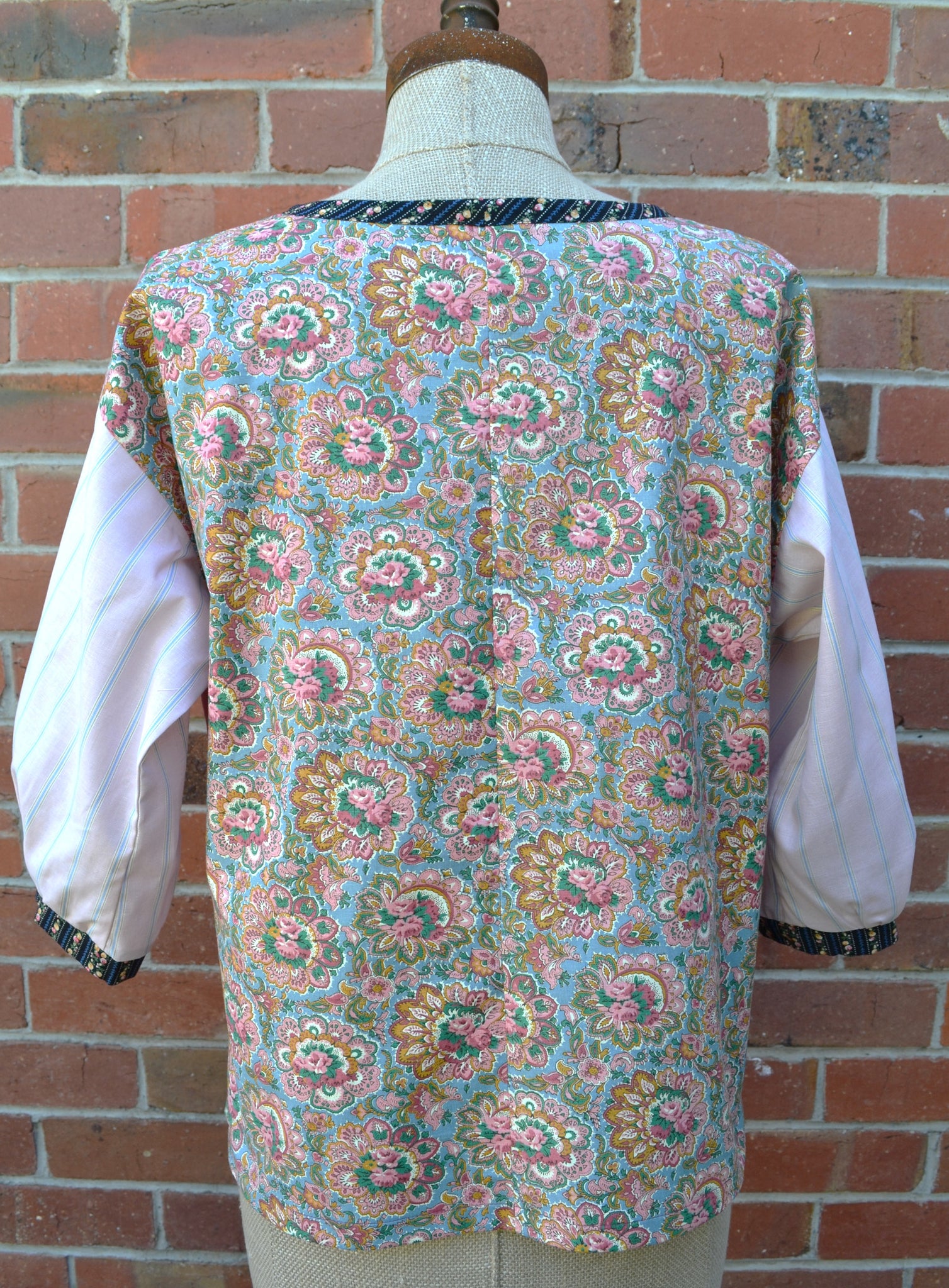 The feature panel on the front in a vintage unused hand embroidered linen doily. The surrounding Rose fabric is cotton linen. The gorgeous vintage print on the back is cotton, and we have cut the sleeves from a light cotton with a woven stripe. The neck binding and cuffs and also cotton.