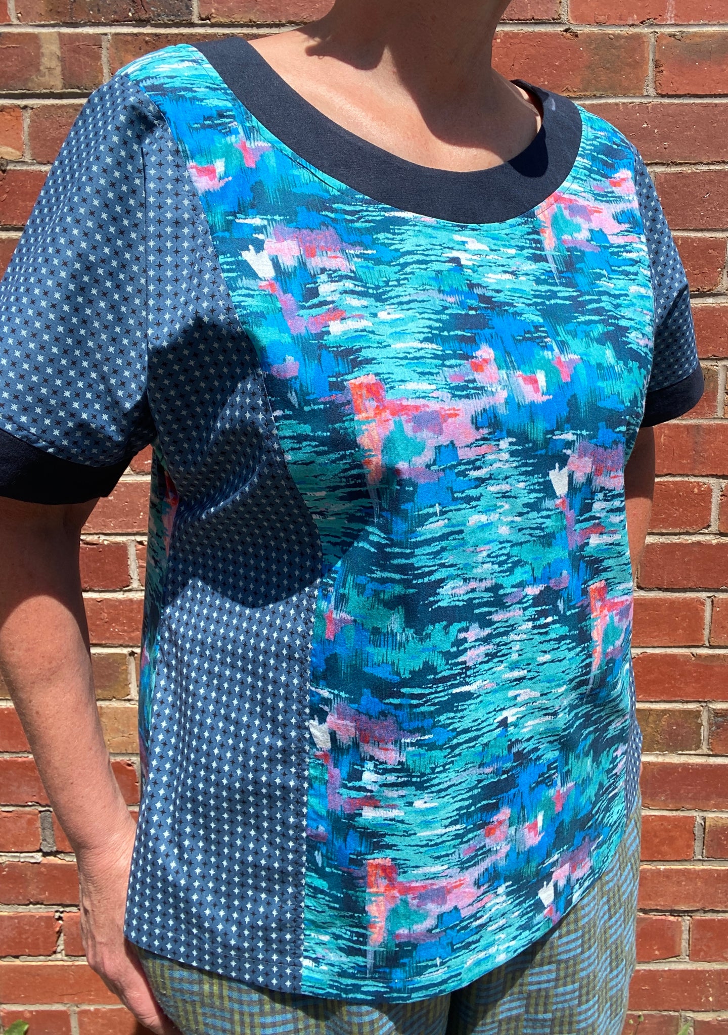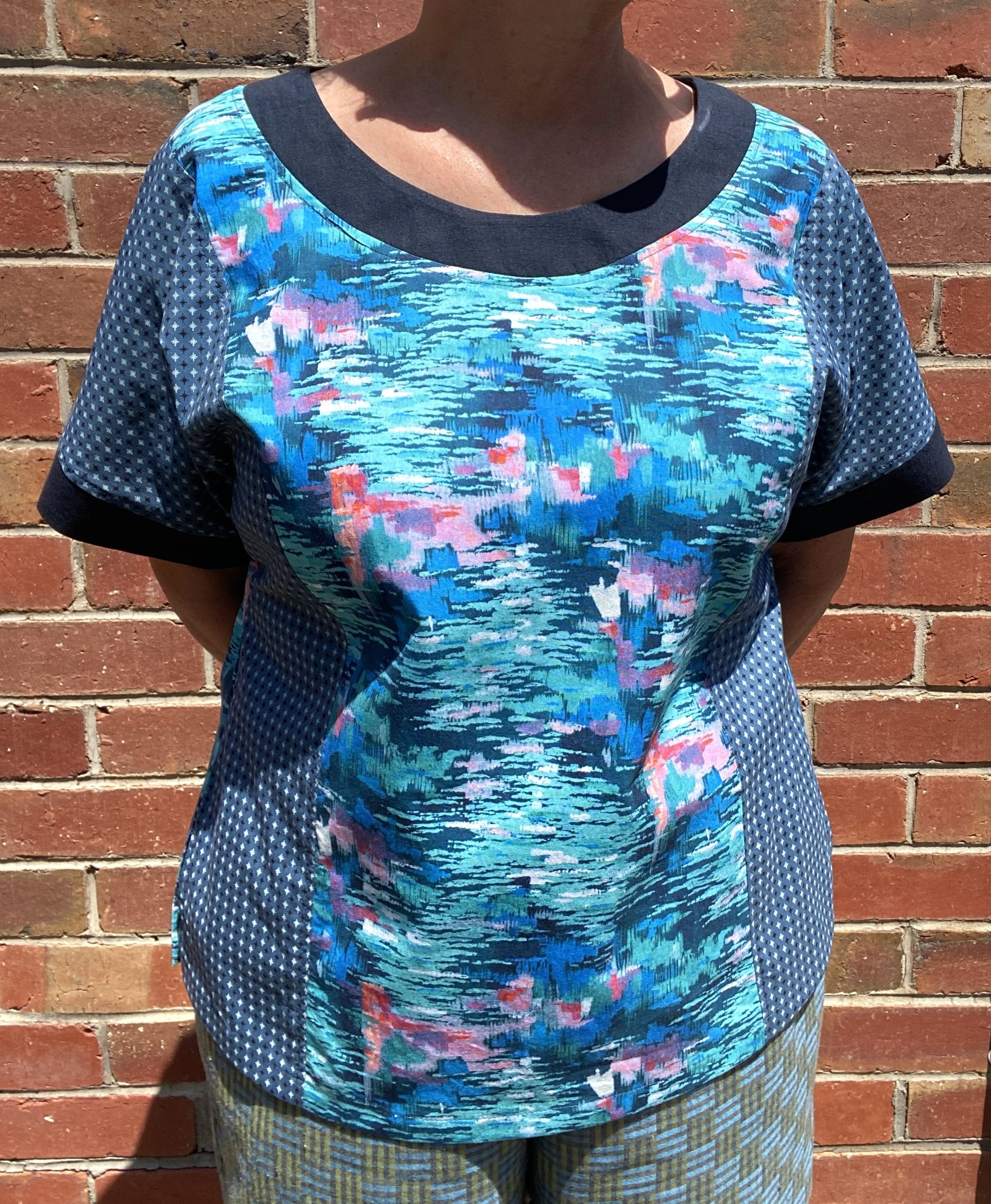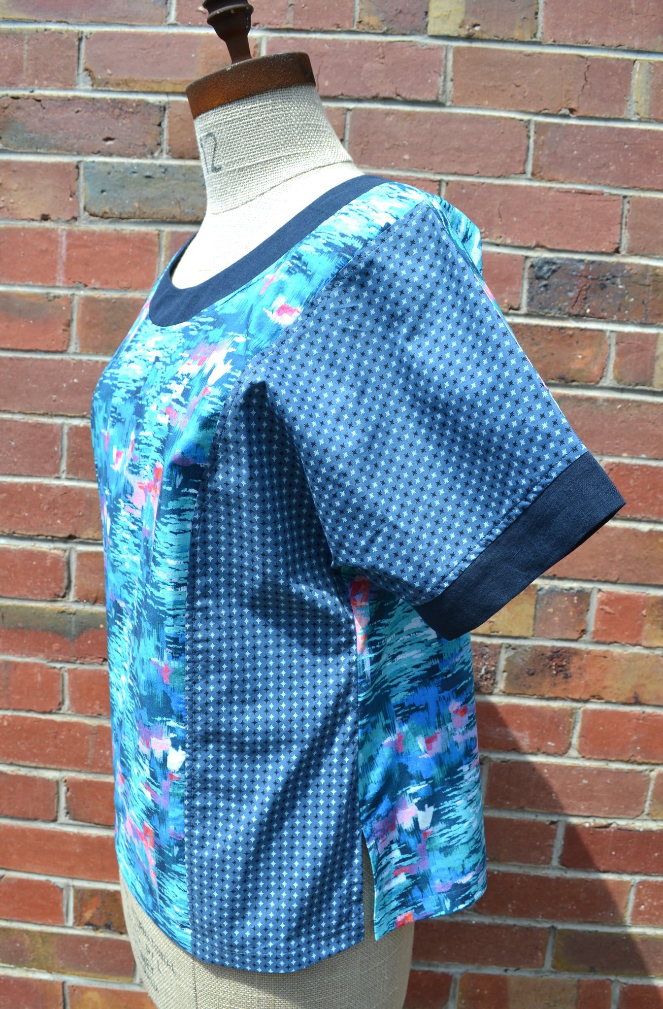 This style has an extended shoulder, flattering front contrast side panel, and side splits. The sleeve cuffs and fused neckband are cut from a dark blue/light navy cotton linen blend.