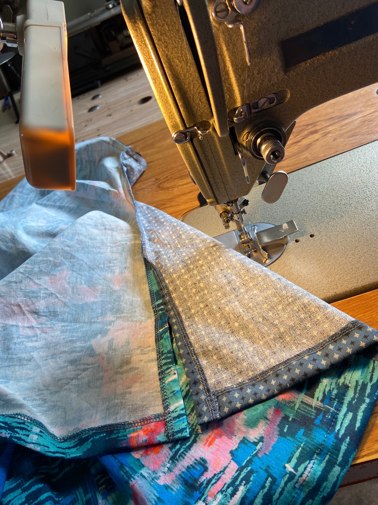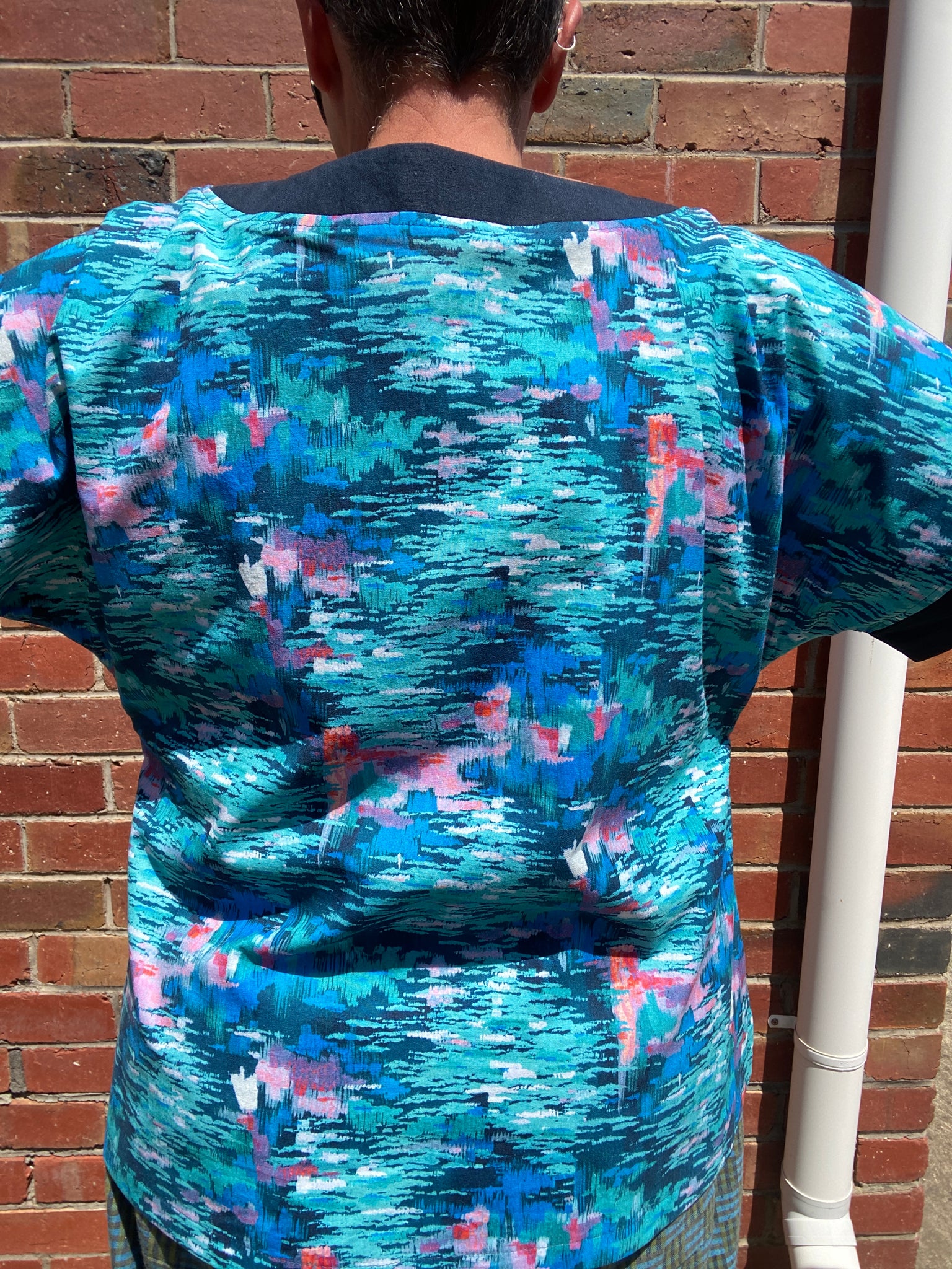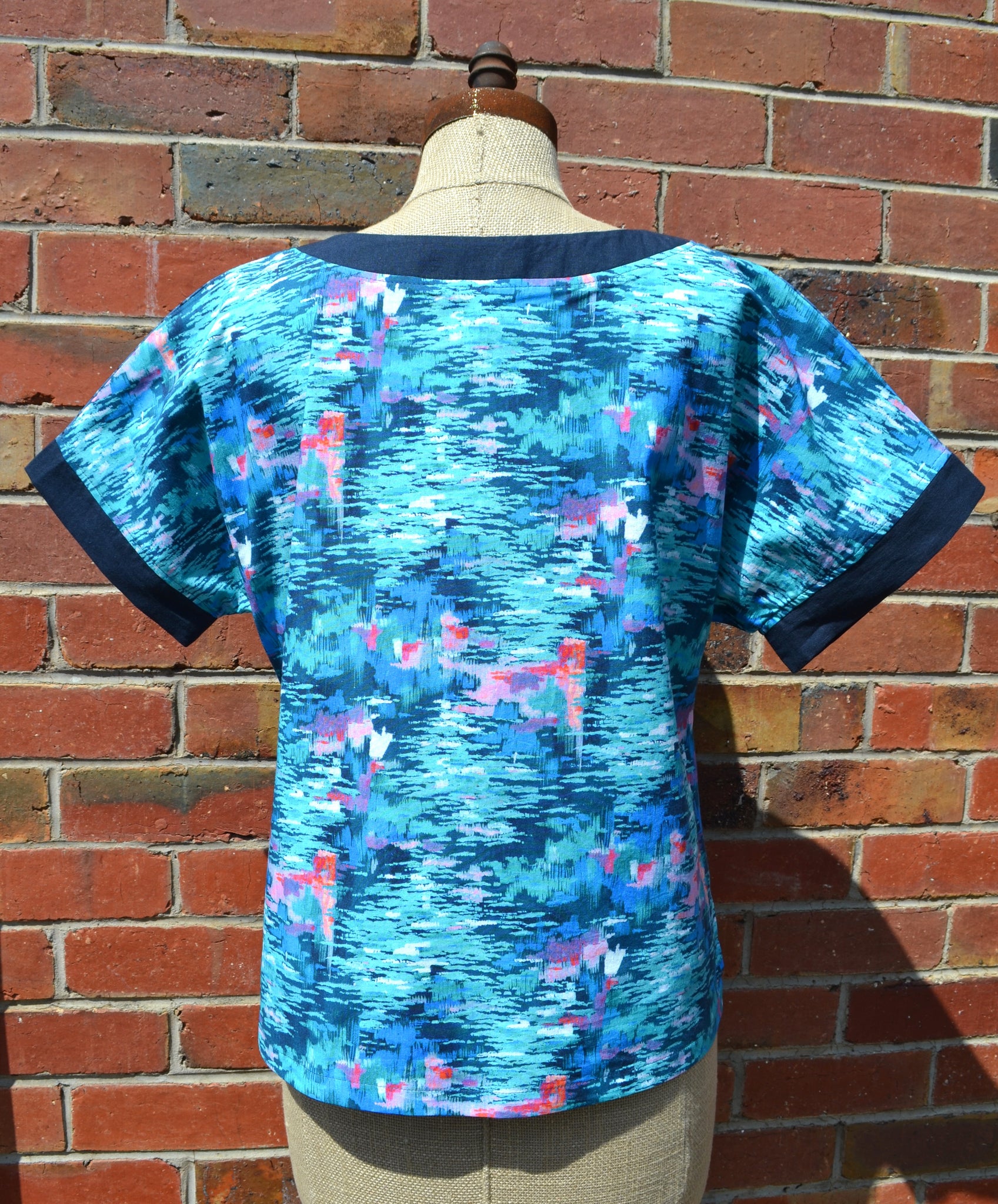 This style has an extended shoulder, flattering front contrast side panel, and side splits. The sleeve cuffs and fused neckband are cut from a dark blue/light navy cotton linen blend.